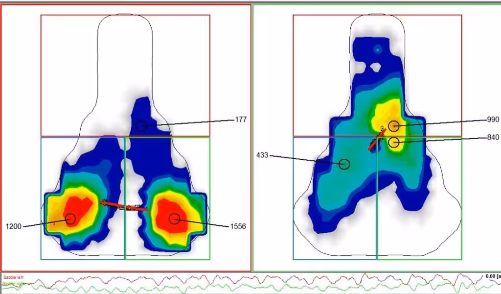 Ból okolicy krocza spowodowany nadmiernym obciążeniem przodu siodełka oraz punktowe bóle na wysokości szerszej części podparcia to jedne z najczęściej zgłaszanych przypadków (oba przedstawione na odcisku tensometrycznym zrobionym matami @gebiomized).